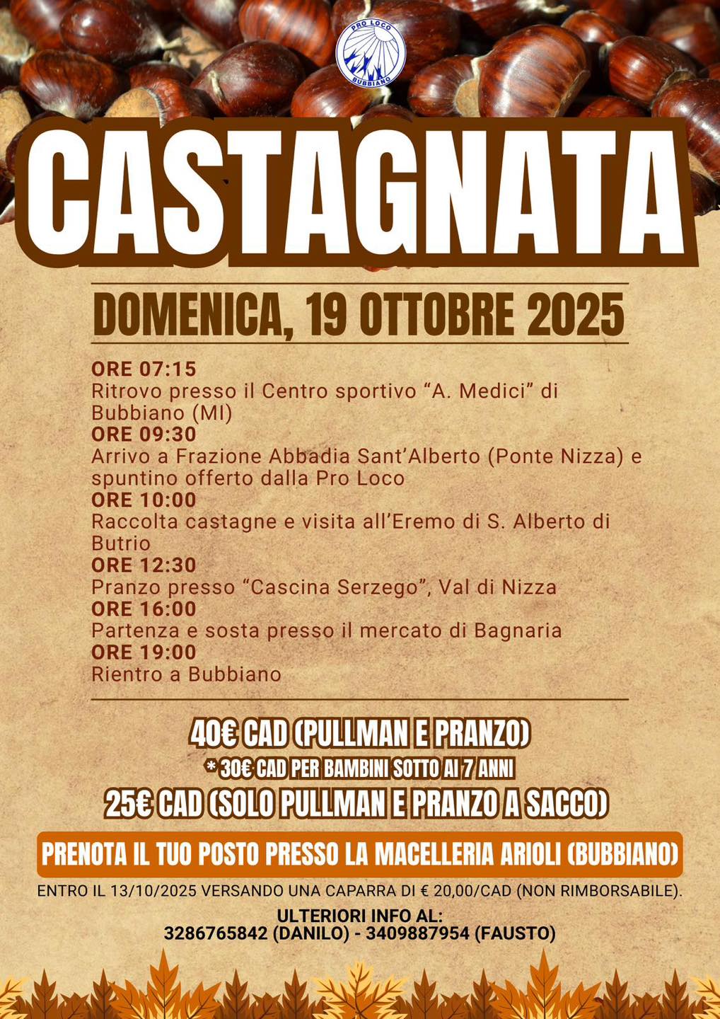 ORA Programma: 🕖 07:15 – Partenza dal Centro sportivo “A. Medici” di Bubbiano 🥐 09:30 – Arrivo a Ponte Nizza con spuntino offerto dalla Pro Loco 🌰 10:00 – Raccolta castagne e visita all’Eremo di S. Alberto di Butrio 🍽️ 12:30 – Pranzo alla “Cascina Serzego” 🛍️ 16:00 – Sosta al mercato di Bagnaria 🏠 19:00 – Rientro a Bubbiano